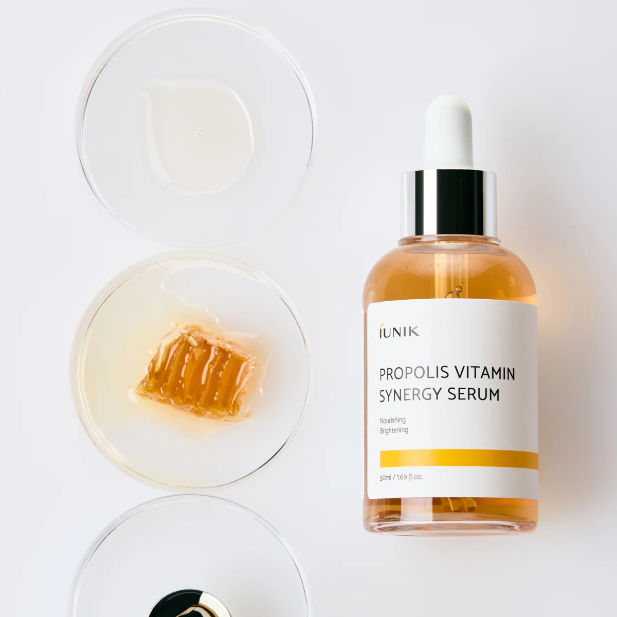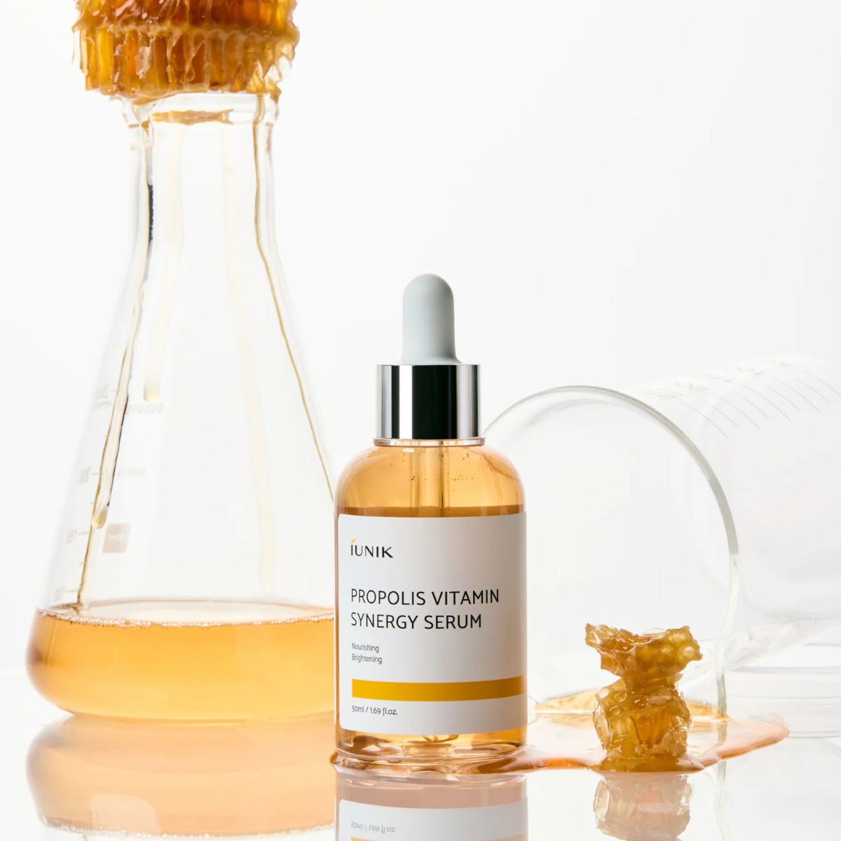 High-level description: A soothing and revitalising serum concentrated with propolis, niacinamide, and vitamin-rich botanicals to calm irritation, brighten dull tone, and nourish the skin barrier. Designed to support clearer pores and a healthier, radiant complexion.